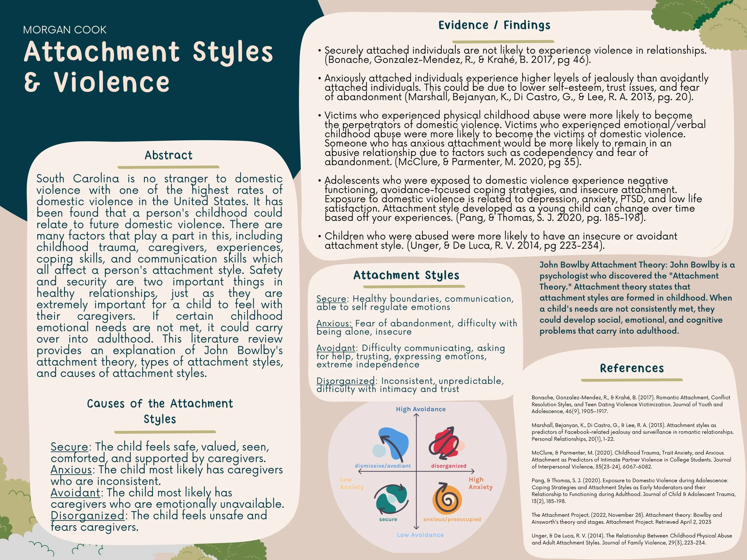 South Carolina is no stranger to domestic violence with one of the highest rates of domestic violence in the United States. It has been found that a person's childhood could relate to future domestic violence. There are many factors that play a part in this, including childhood trauma, caregivers, experiences, coping skills, and communication skills which all affect a person's attachment style. Safety and security are two important things in healthy relationships, just as they are extremely important for a child to feel with their caregivers. If certain childhood emotional needs are not met, it could carry over into adulthood. This literature review provides an explanation of John Bowlby's attachment theory, types of attachment styles, and causes of attachment styles.